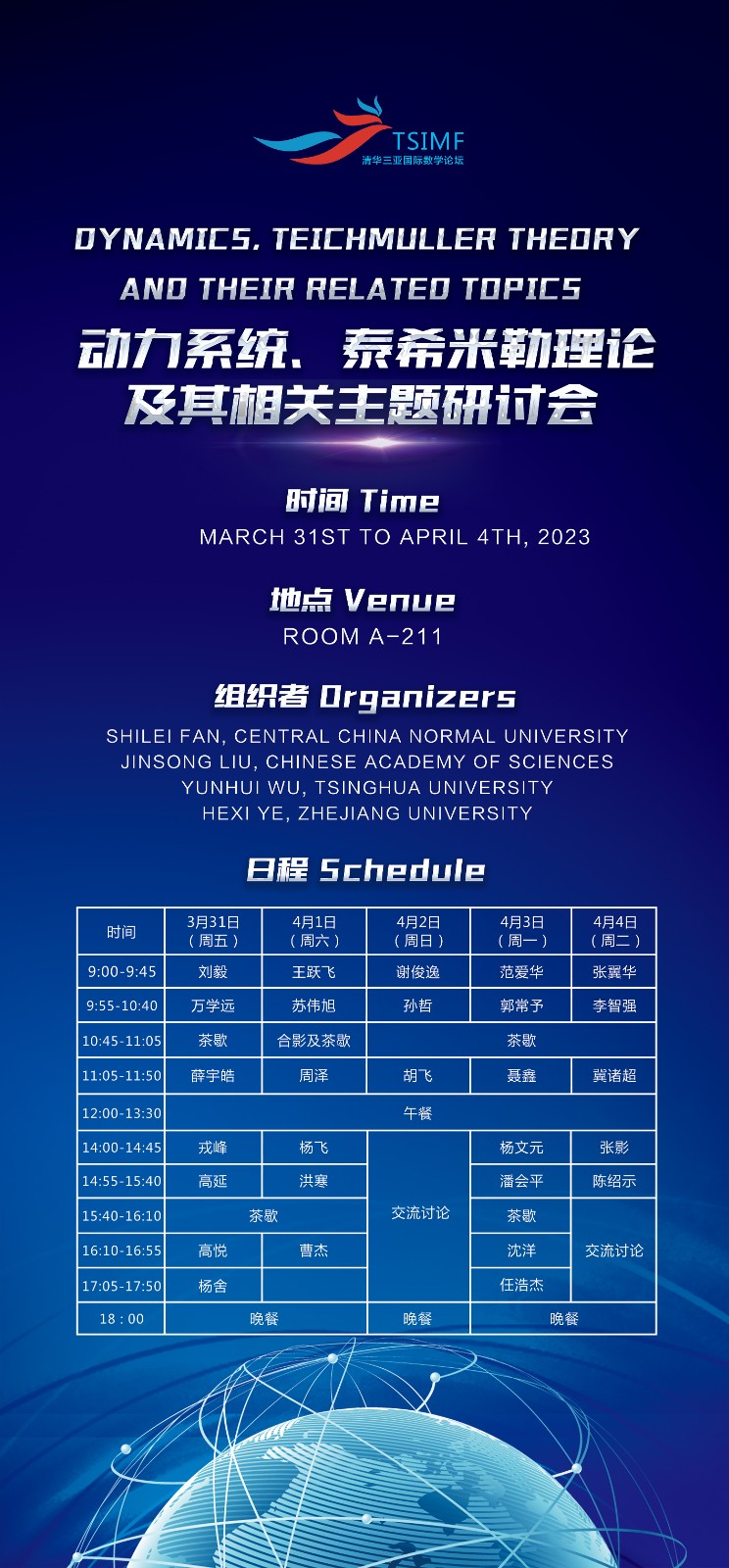 2023年3月31日-4月4日,由华中师范大学凡石磊、中国科学院刘劲松、清华大学吴云辉和浙江大学叶和溪老师组织的2023“动力系统,Teichmuller理论及相关主题”学术会议(Dynamics, Teichmuller theory and their related topics)将在清华三亚国际数学论坛如期举行,本次会议共有76位来自国内数所院校或研究机构的数学学者参加,会议期间就动力系统,Teichmuller理论及相关主题展开研讨,届时将举行28场相关学术报告。