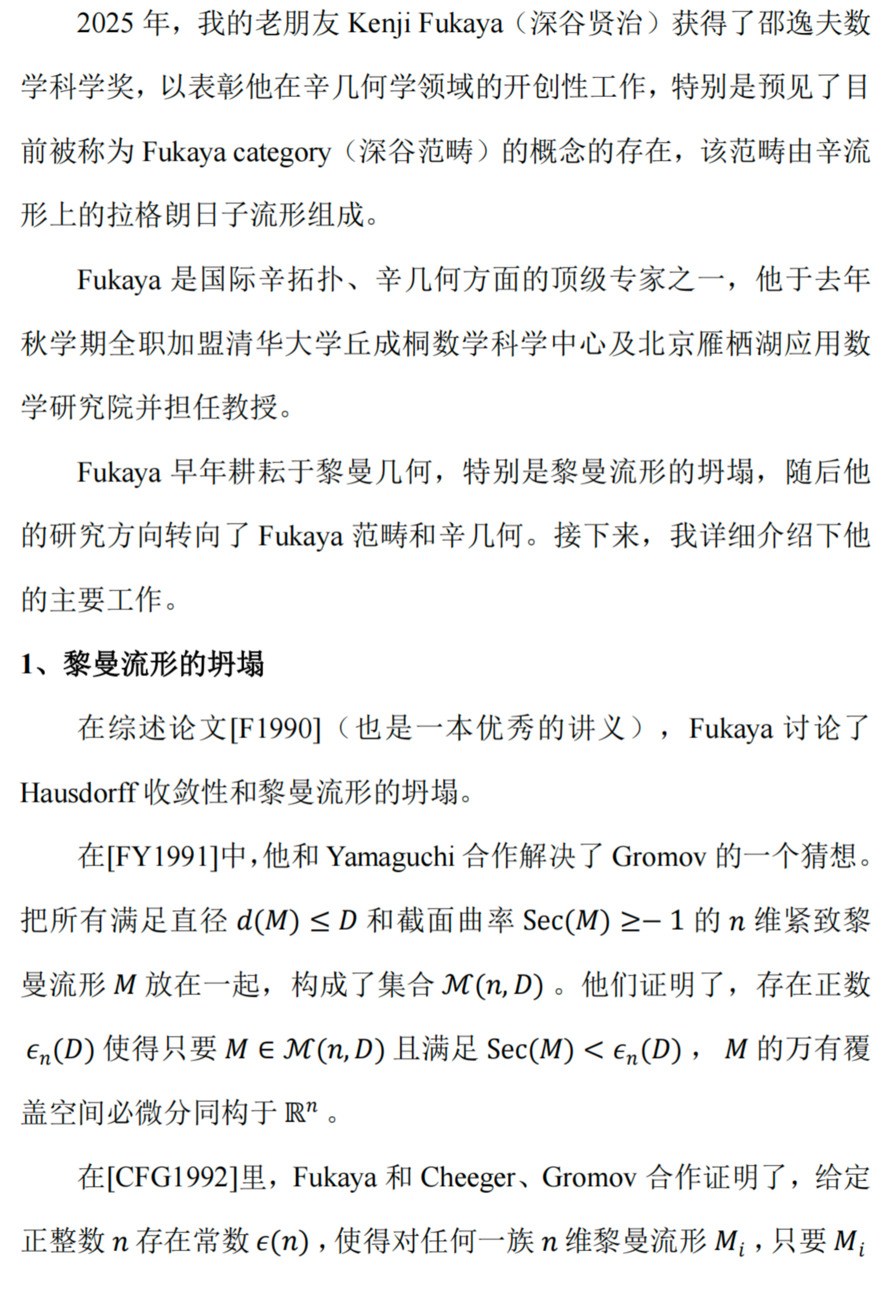 丘成桐:祝贺 Kenji Fukaya 荣获邵逸夫数学科学奖