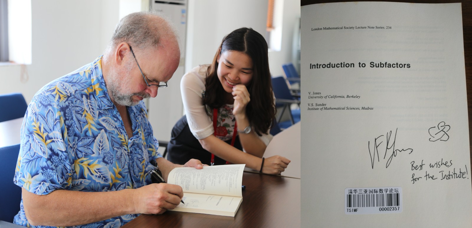 会议期间,我们找了一个机会,请琼斯教授接受我们的采访,并请他在清华三亚国际数学论坛图书馆的“菲尔兹奖获得者著作特藏”中收藏的他本人的著作上签名。琼斯教授欣然同意了我们的请求。