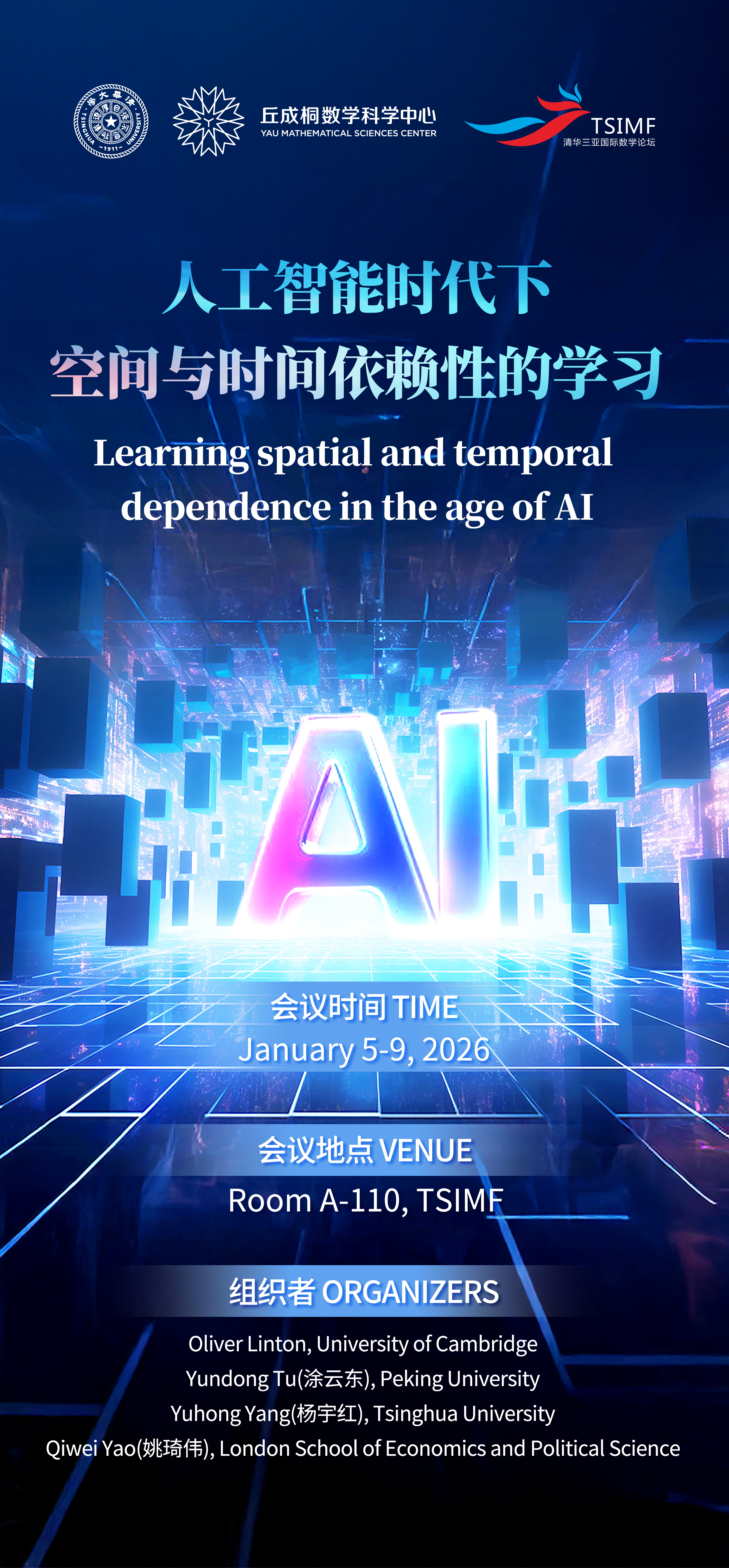 This workshop aims to draw energy and inspiration from the recent development in machine learning (ML) including DNN to tackle some important challenges in complex time series analysis and spatial statistics, and reversely from tools of analyzing dependent data to aid ML. It will gather the leading scholars as well as young researchers in this broad area to reflect and to exchange the new advancements in the analysis of complex dependent data, with a balanced focus on methodology, theory, and algorithms. The key topics include (i) modelling complex time series including tensor processes, dynamic networks, and spatial-temporal processes, (ii) nonlinear PCA/ICA for time series, (iii) nonstationary spatial processes and spatial cointegration, (iv) change-point/anomaly detection in time and/or over space, (v) applications of tools of analyzing dependent data in ML/AI.