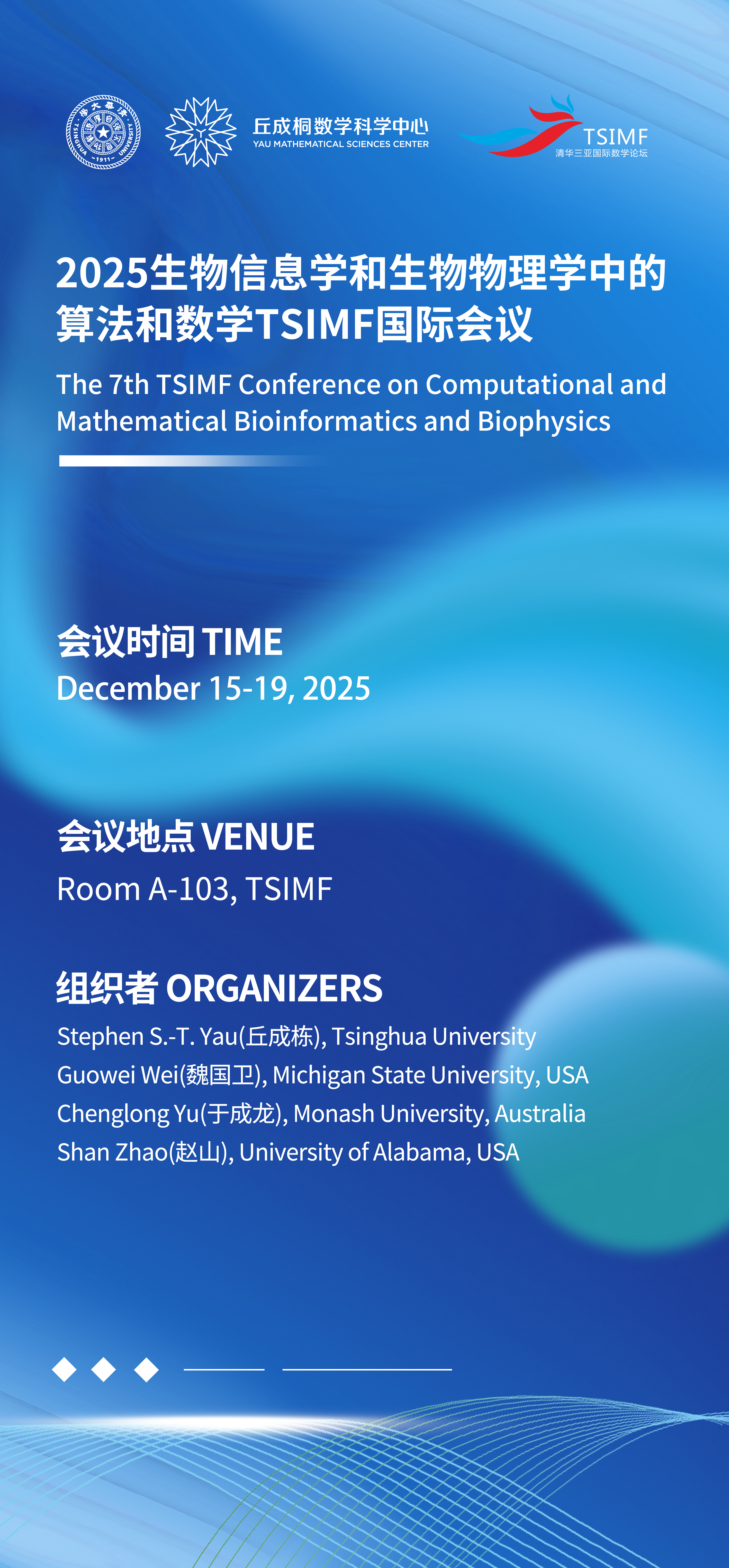 The TSIMF annual workshop series on “Computational and Mathematical Biophysics and Bioinformatics” has been successfully held for six times from 2018 – 2024. Four workshops were in-person events and took place at the Sanya, while the third and fourth workshop was held online through the Zoom in Dec. 2020 and Dec. 2021, respectively.