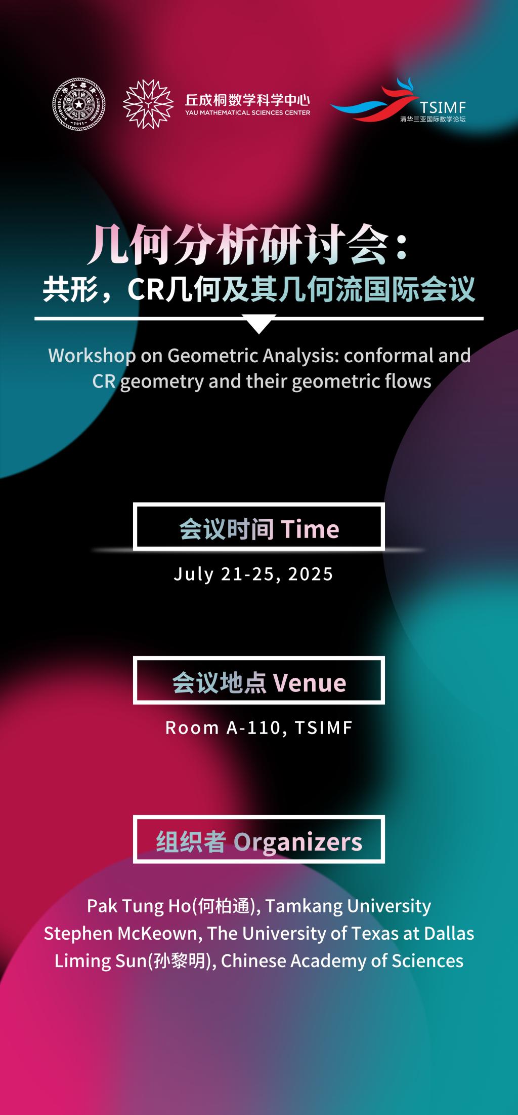 In this workshop, we plan to cover a wide variety of topics in Geometric Analysis, with emphasis on conformal geometry and CR geometry and their geometric flow. We plan to invite speakers to talk about the most recent topics in this field. Topics include CR Yamabe problem, minimal surface, mean curvature flow, Paneitz operator, Poincare-Einstein metric, Q-curvature, Q’-curvature in CR geometry, Yamabe problem, Yamabe flow, related fully nonlinear partial differential equations, and geometric partial differential equations.