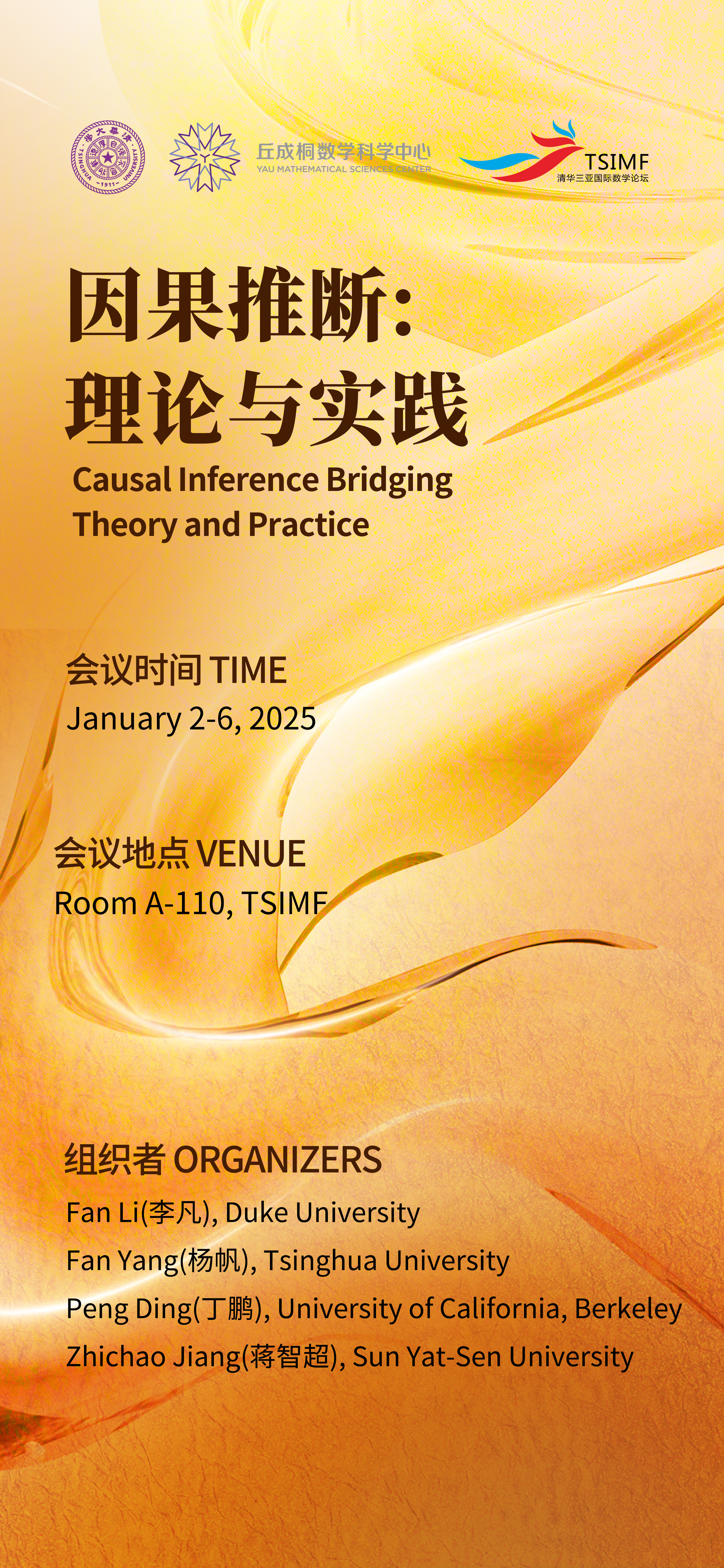 This workshop aims to bring together a group of respected and active researchers to present their ongoing work in several most important current areas of causal inference, including complex randomized experiments, natural experiments, machine learning methods, software development, and interdisciplinary applications. It will provide an opportunity for researchers at different career stages to exchange ideas with internationally leading experts and foster new collaborations in an intimate environment. In particular, the workshop will provide a platform for young researchers to showcase their achievements and network. Overall, the workshop is expected to contribute to building and strengthening the causal inference community in China.