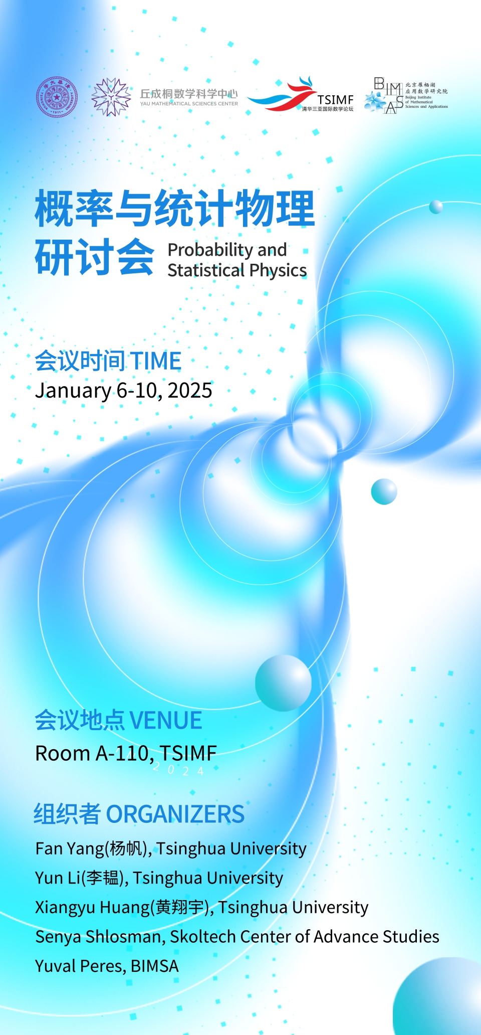 The conference aims to bring together the leading experts and early-career researchers in the field of probability and statistical physics, with the overall goal to present the most active research in current times and discuss future directions. Around 50 participants from China and oversea are expected. It will be held at Tsinghua Sanya International Mathematics Forum (TSIMF), from January 6th to 10th, 2025.