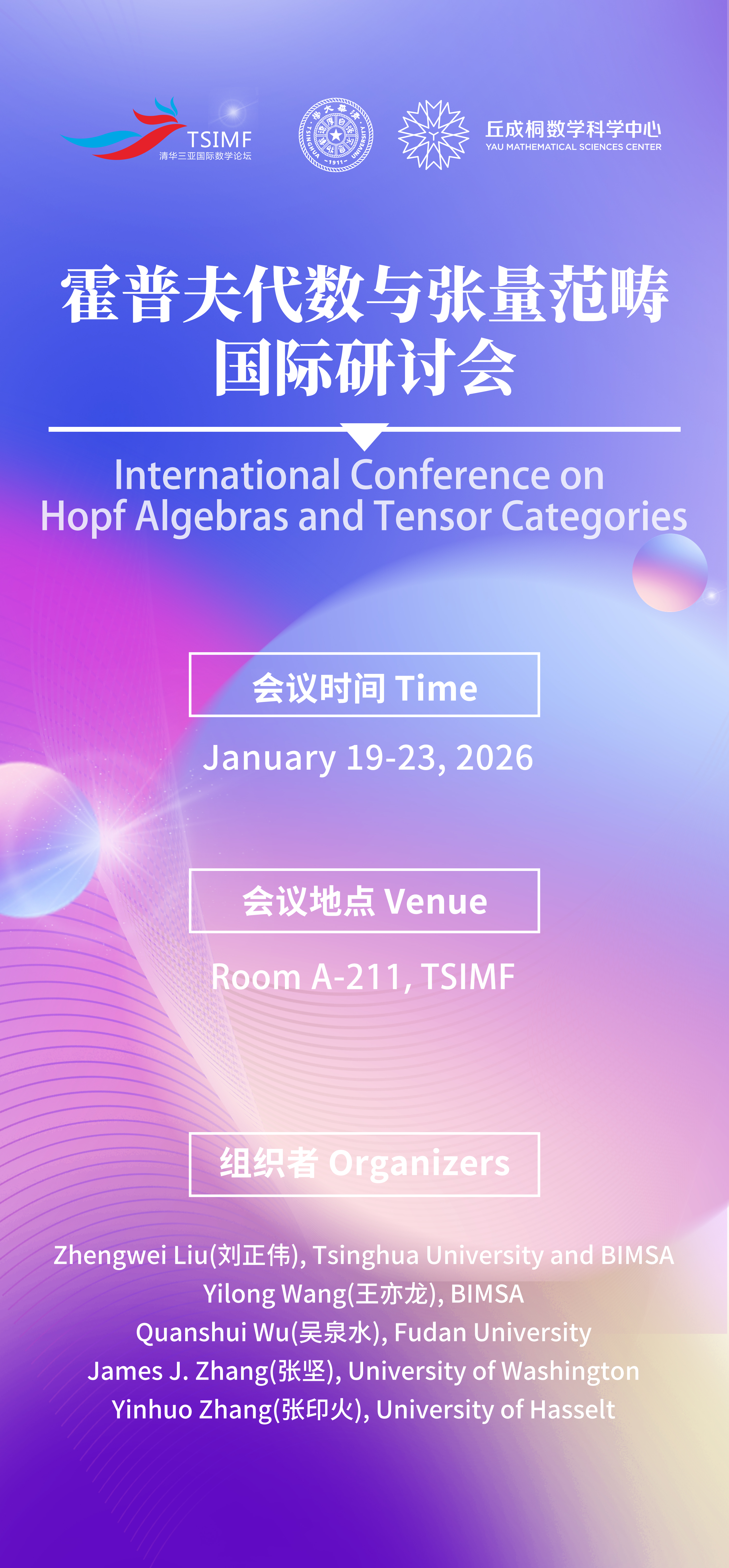 The goal of the conference is to bring together world-renowned experts working on Hopf algebras, tensor categories and related topics to share their cutting edge research works and their visions on the future of the field. We also wish, through the conference, to nurture an ideal environment for international communications, connections, and collaborations.