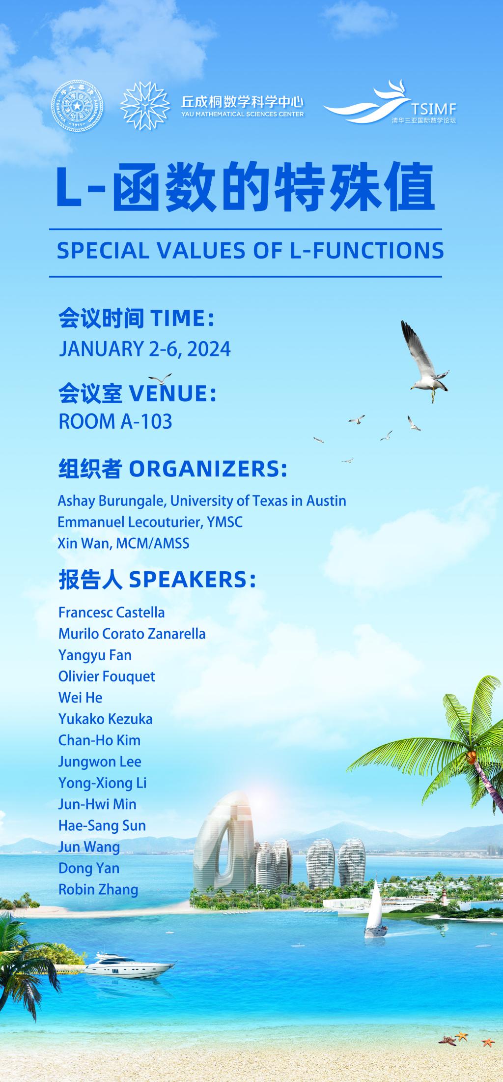 这个会议的主题是L-函数特殊值的算术。BSD猜想将阿贝尔簇的L-函数在s=1处的首项系数与其算术不变量联系在一起。Bloch-Kato猜想是它对于一般motive的大幅推广(包括Artin motive的Stark猜想)。此外它们还有p进情形的类比,例如Mazur-Tate-Teitelbaum猜想(类比于BSD猜想)以及Gross-Stark猜想(类比于Stark猜想)。在某些情形还有一些精细化的猜想(在模p情形),例如Mazur-Tate猜想。